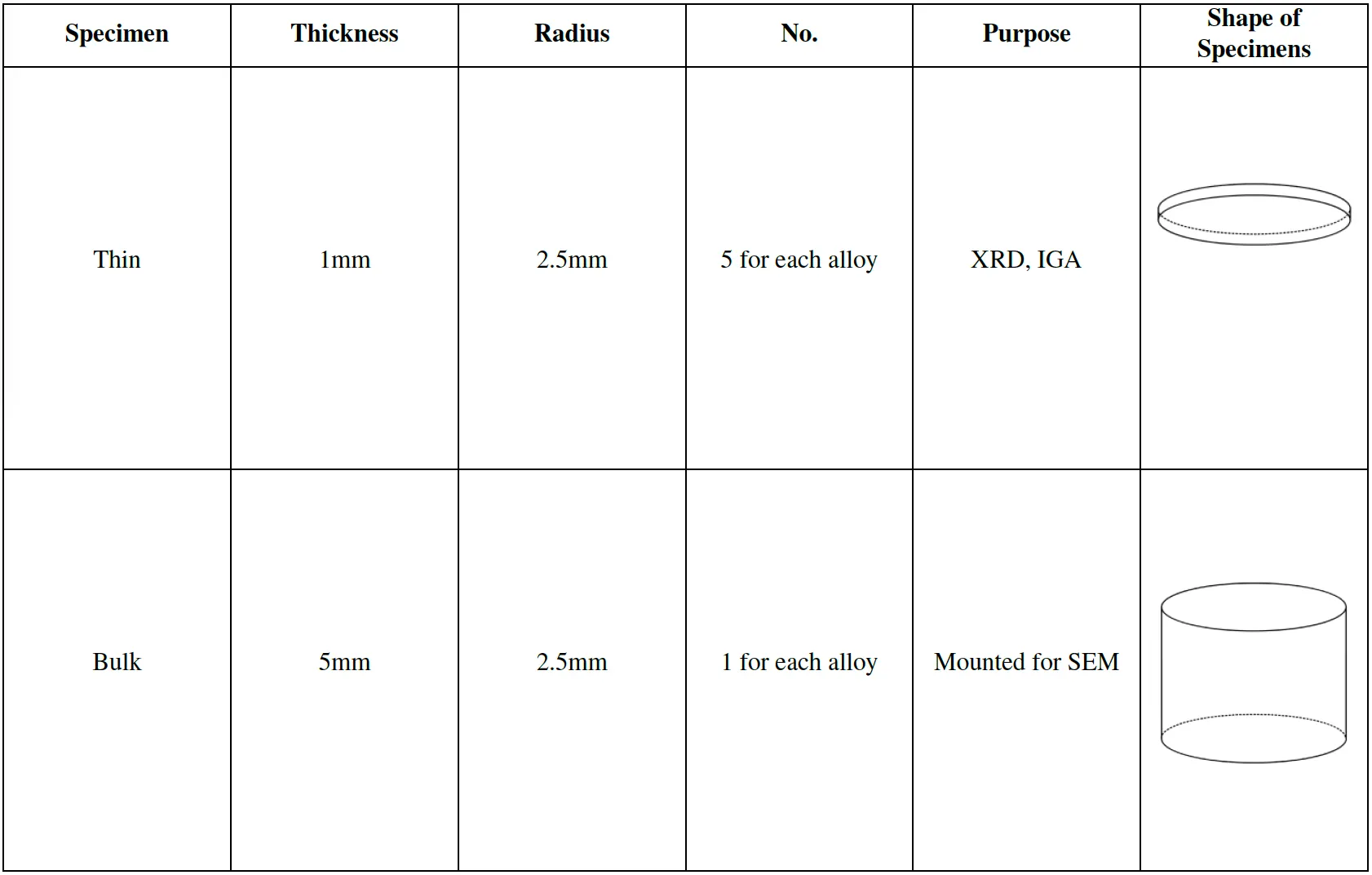 Shapes: Thin (1mm) and bulk (5mm) samples were prepared for different tests, including XRD, SEM, and IGA.