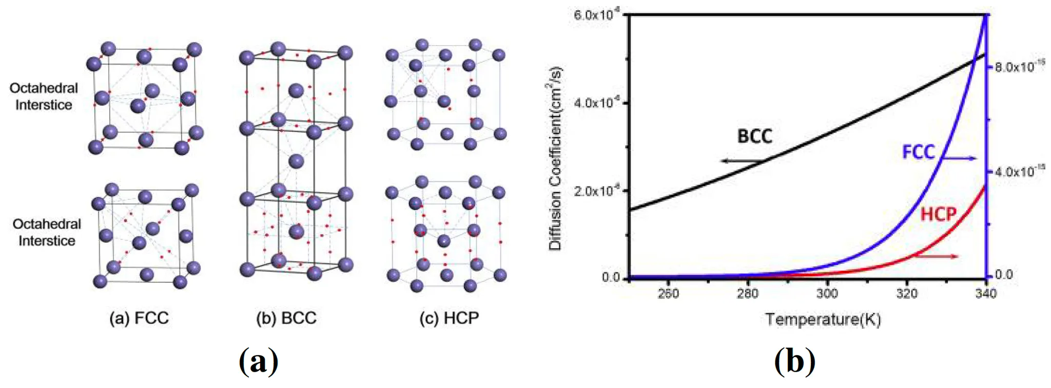 The crystal structure of metals (BCC, FCC, HCP) influences the pathways and speed of hydrogen diffusion: