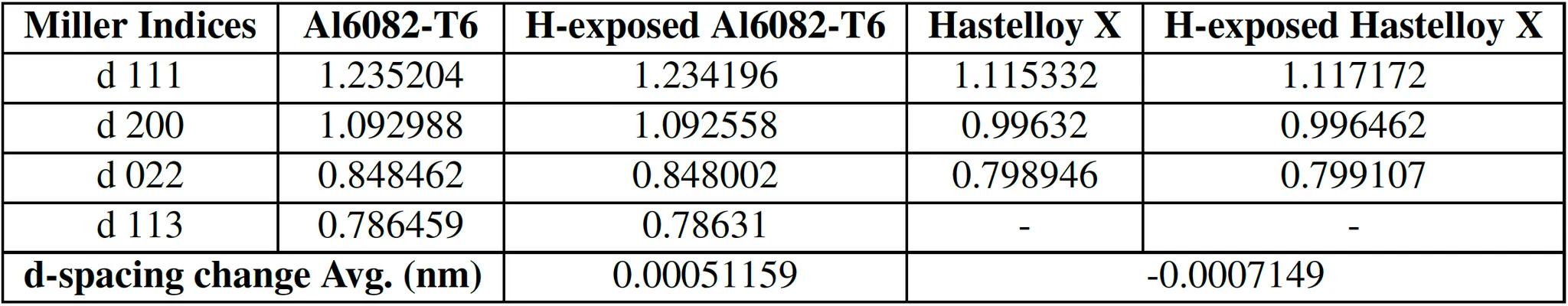 Bragg's Law: Calculated lattice parameters and d-spacing values before and after hydrogen exposure.