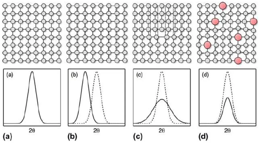 Figure 24: Bragg peaks corresponding lattice distortion situations in single crystal (a) Perfect crystal, (b) peak shifting due to interplanar contraction or expansion, (c) peak broadening due to interplanar spacing by planar defect, and (d) peak size reduction due to point defect