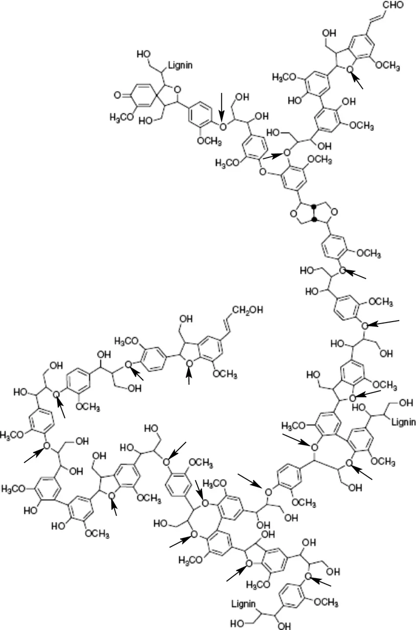 Fig 1. (b) Chemical structure of spruce lignin with α-O-4 and β-O-4 between phenol groups
